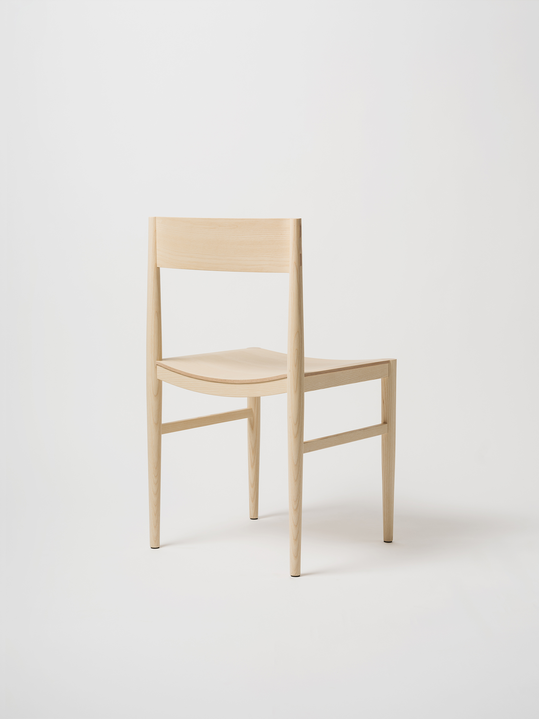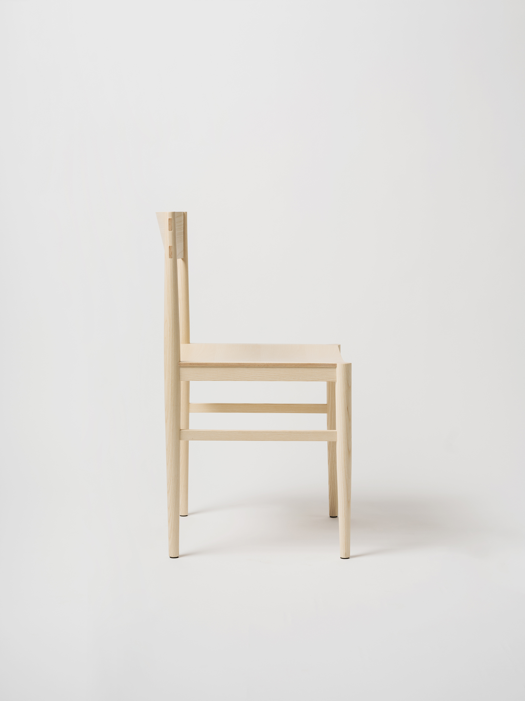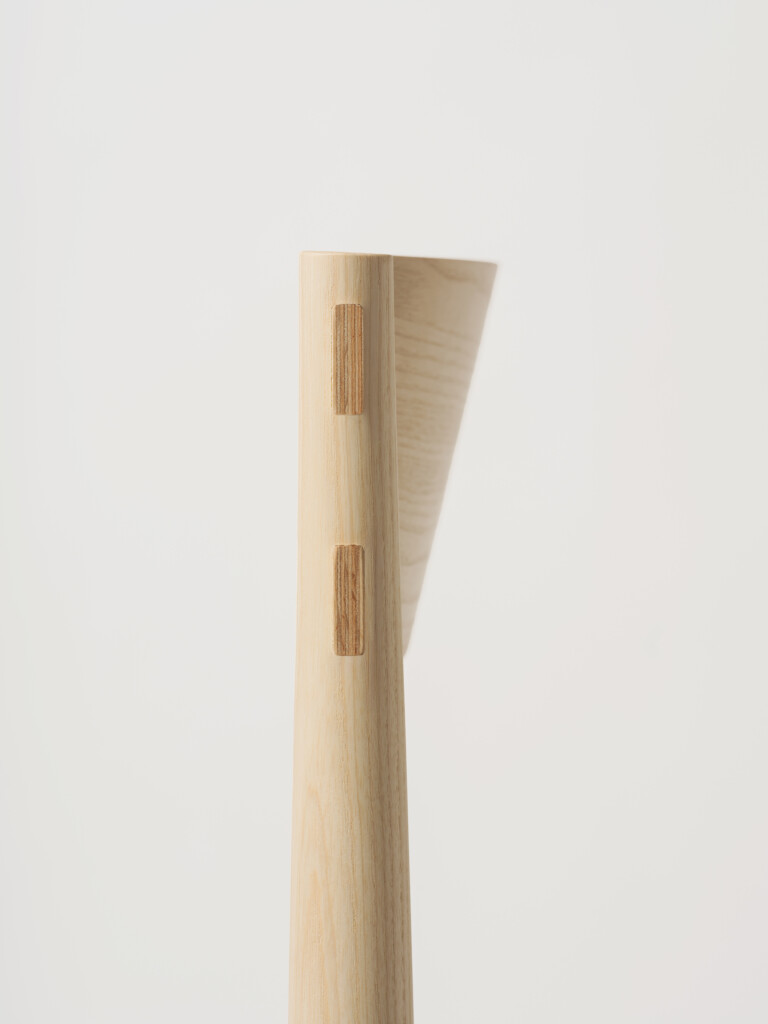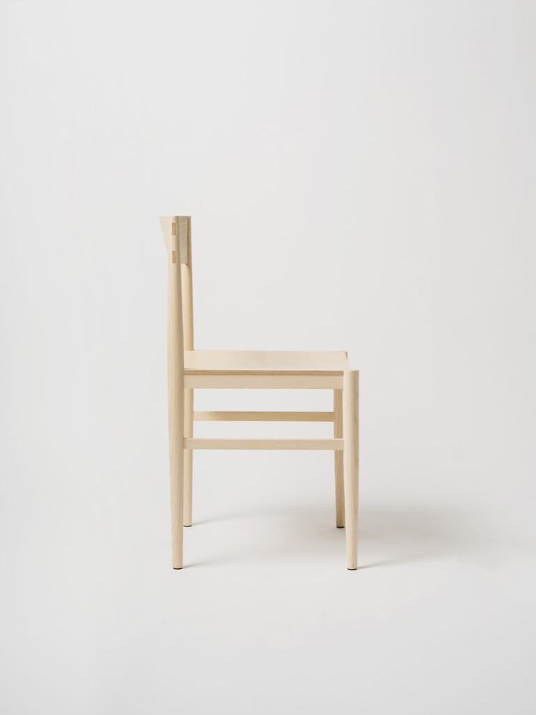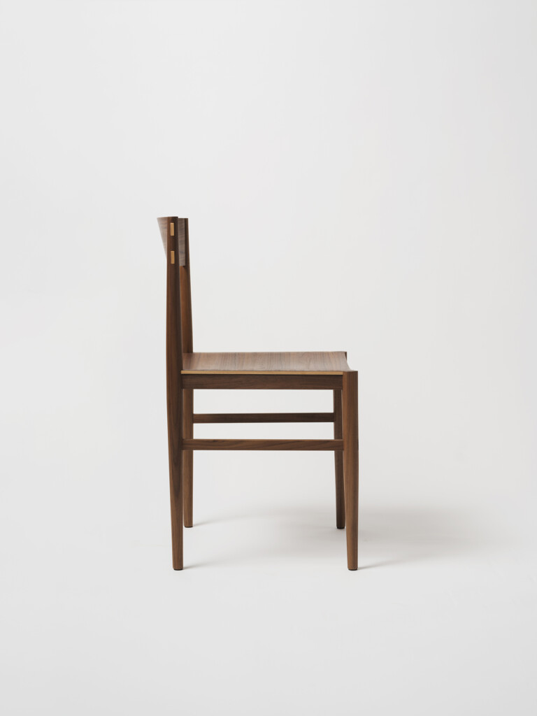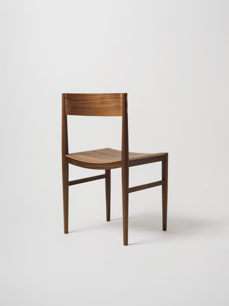 The backrest is made through a process of laminating thin wooden veneers, glued and shaped in a mould. The stretchers are gently curved to better accommodate the seated posture, and both the side stretchers and the backrest are joined to the legs using through mortise and tenon joints, reinforced with wedges. This method ensures a union that is both chemically solid (through the glue) and mechanically strong (through the wedges).
