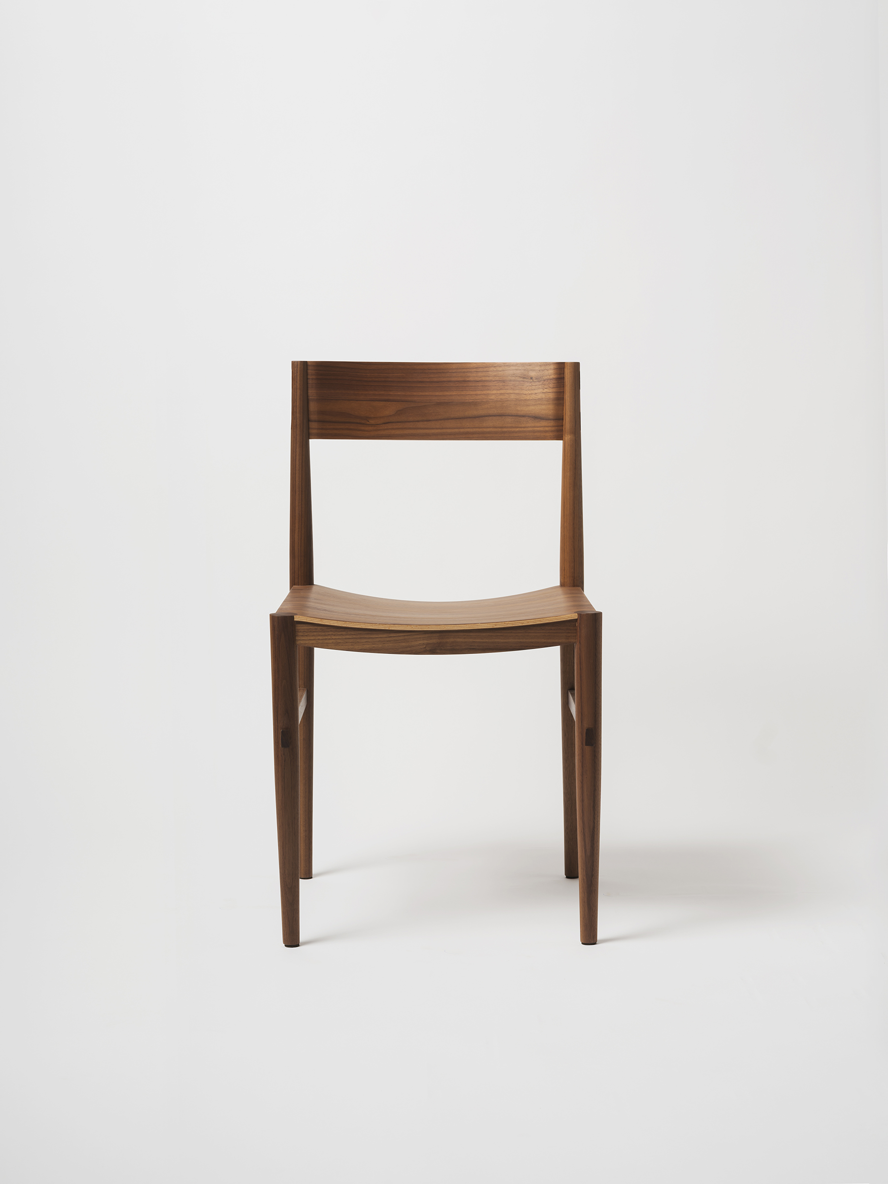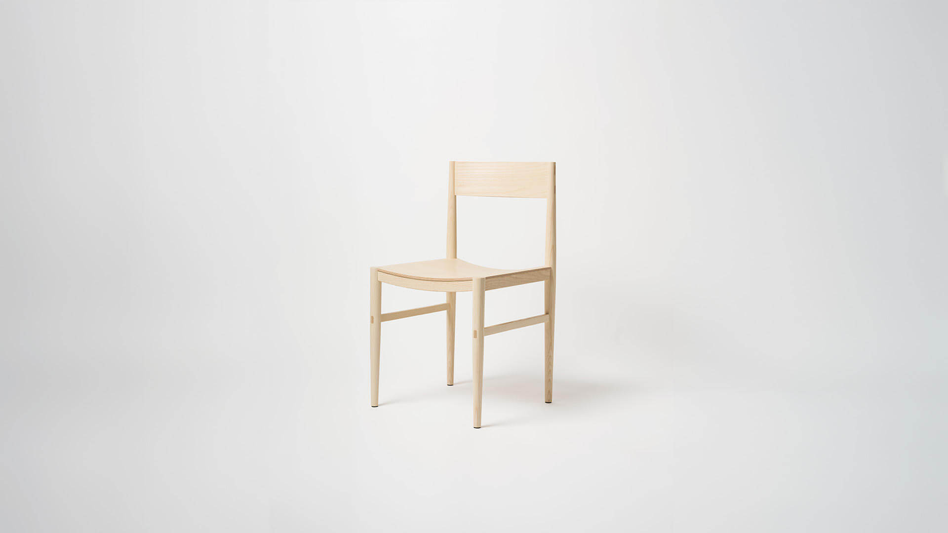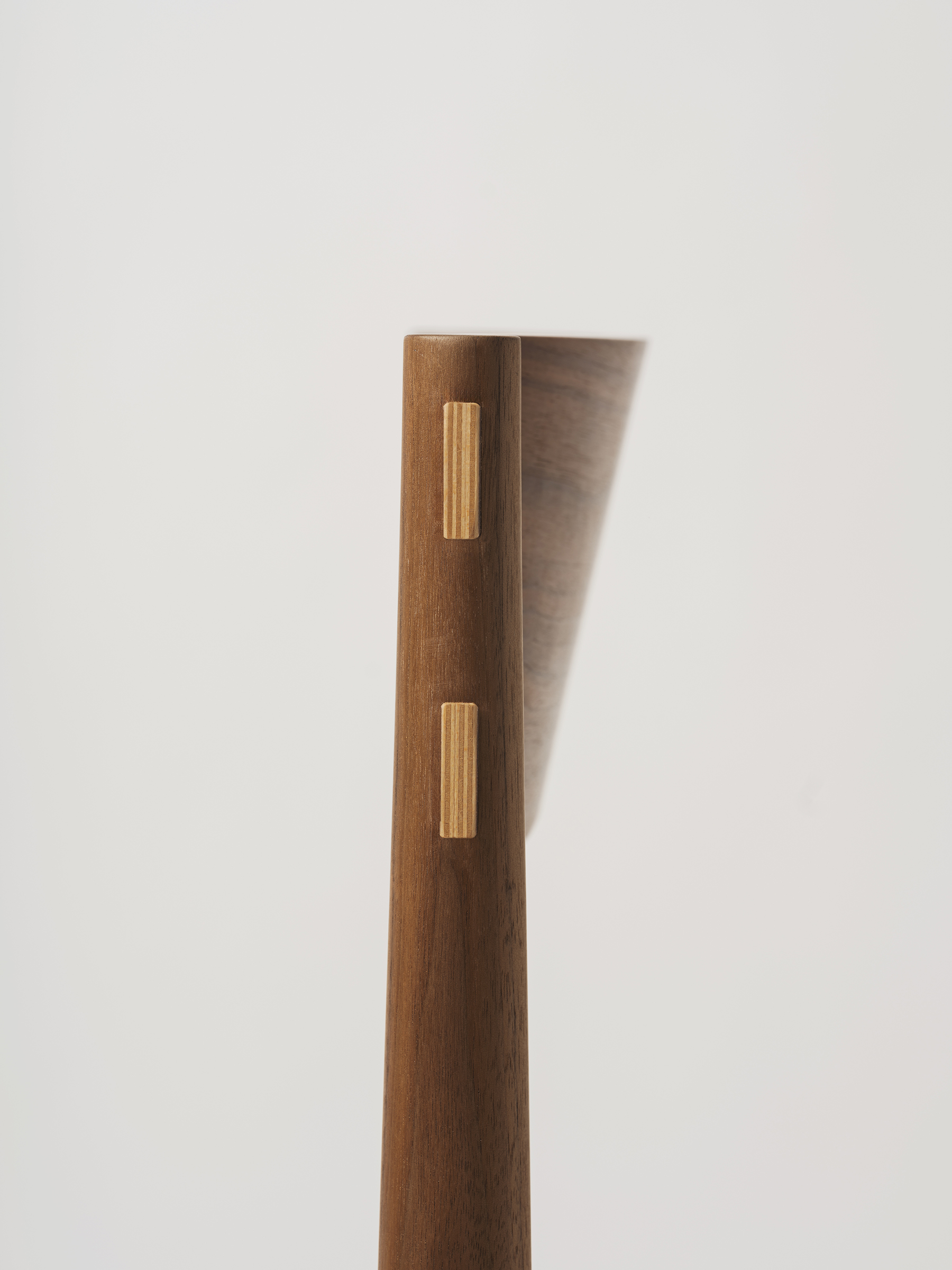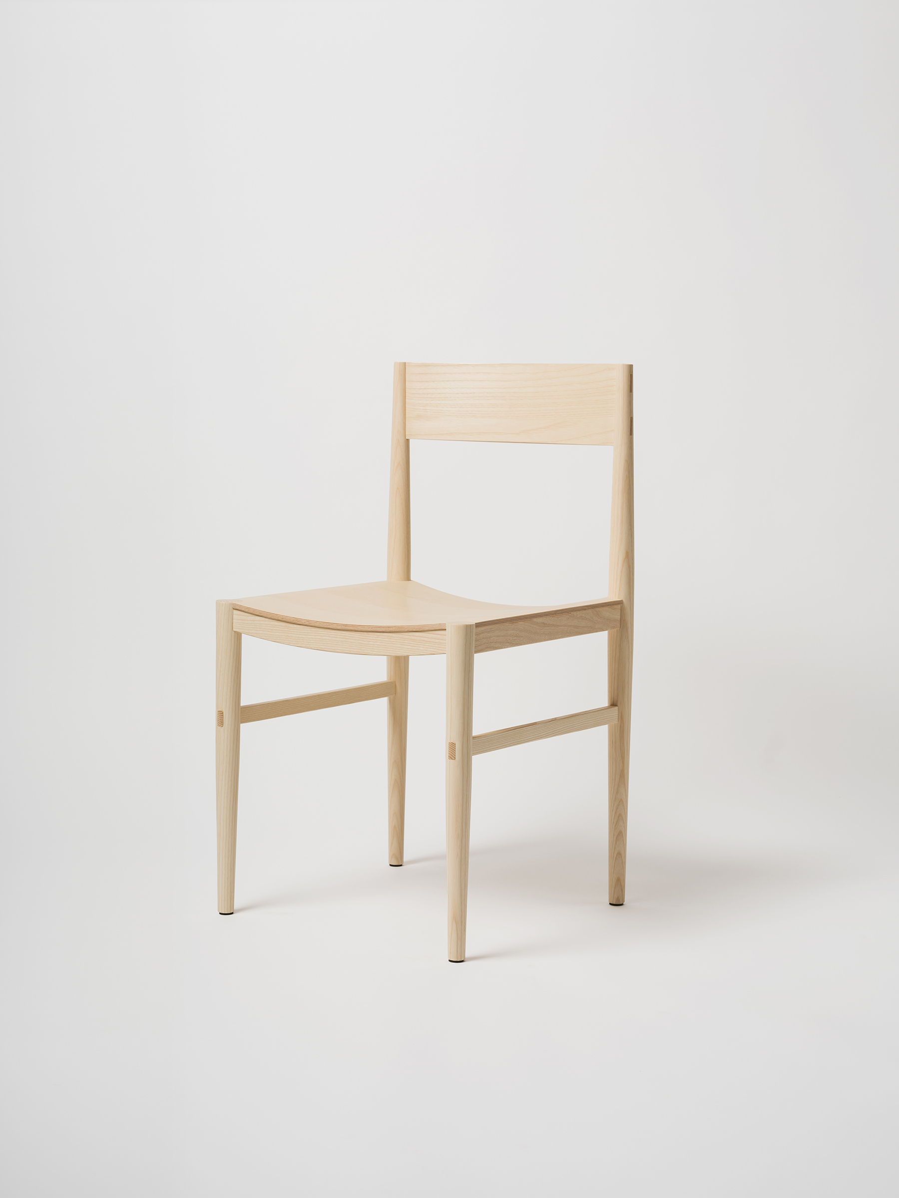 The backrest is made through a process of laminating thin wooden veneers, glued and shaped in a mould. The stretchers are gently curved to better accommodate the seated posture, and both the side stretchers and the backrest are joined to the legs using through mortise and tenon joints, reinforced with wedges. This method ensures a union that is both chemically solid (through the glue) and mechanically strong (through the wedges).